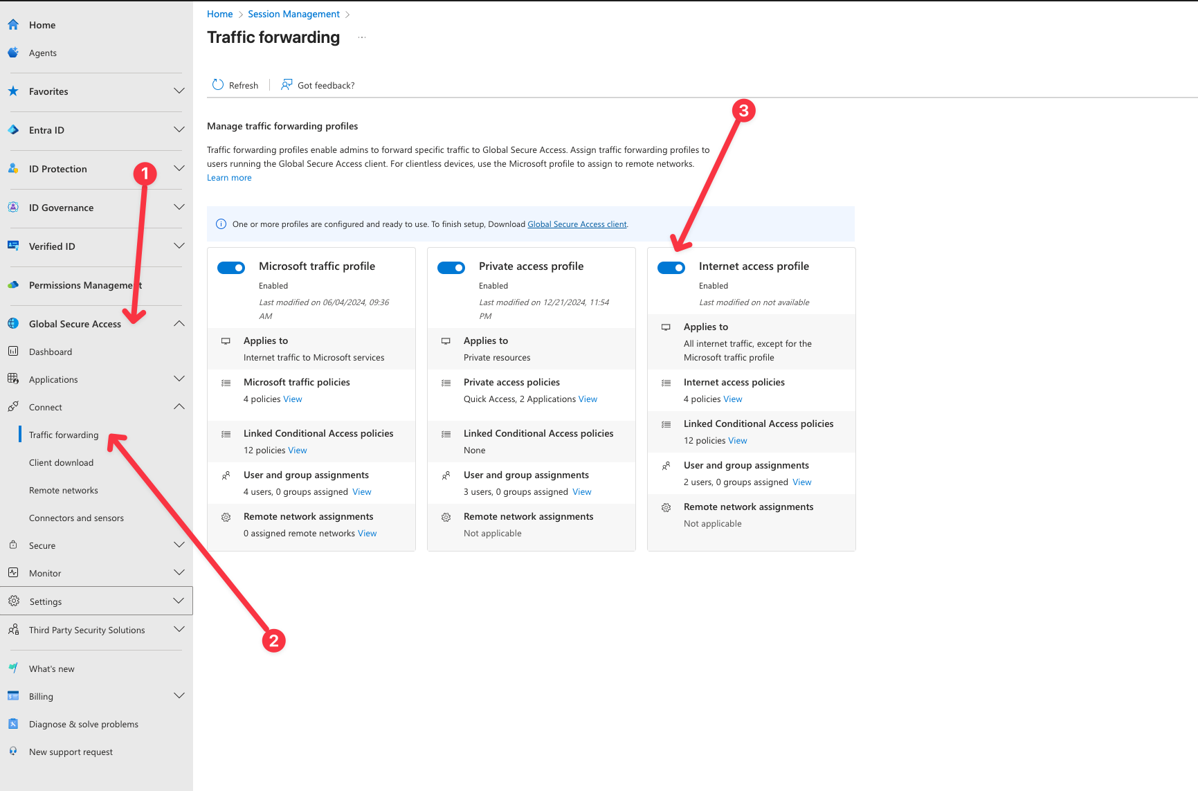 - In Entra Portal, click on Global Secure Access -> Connect -> Traffic forwarding