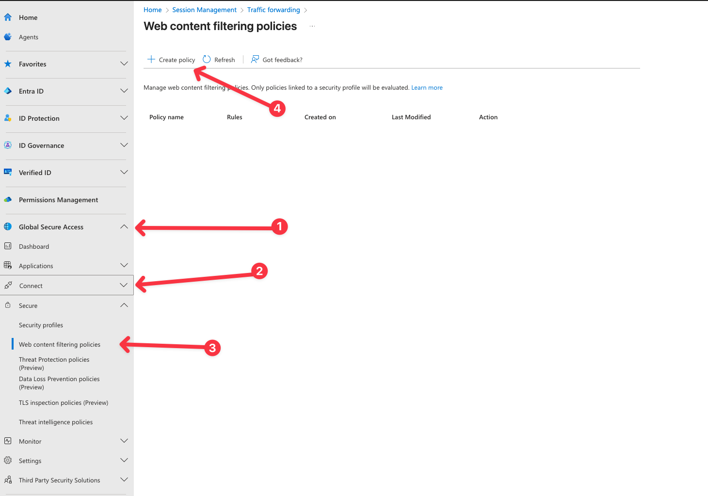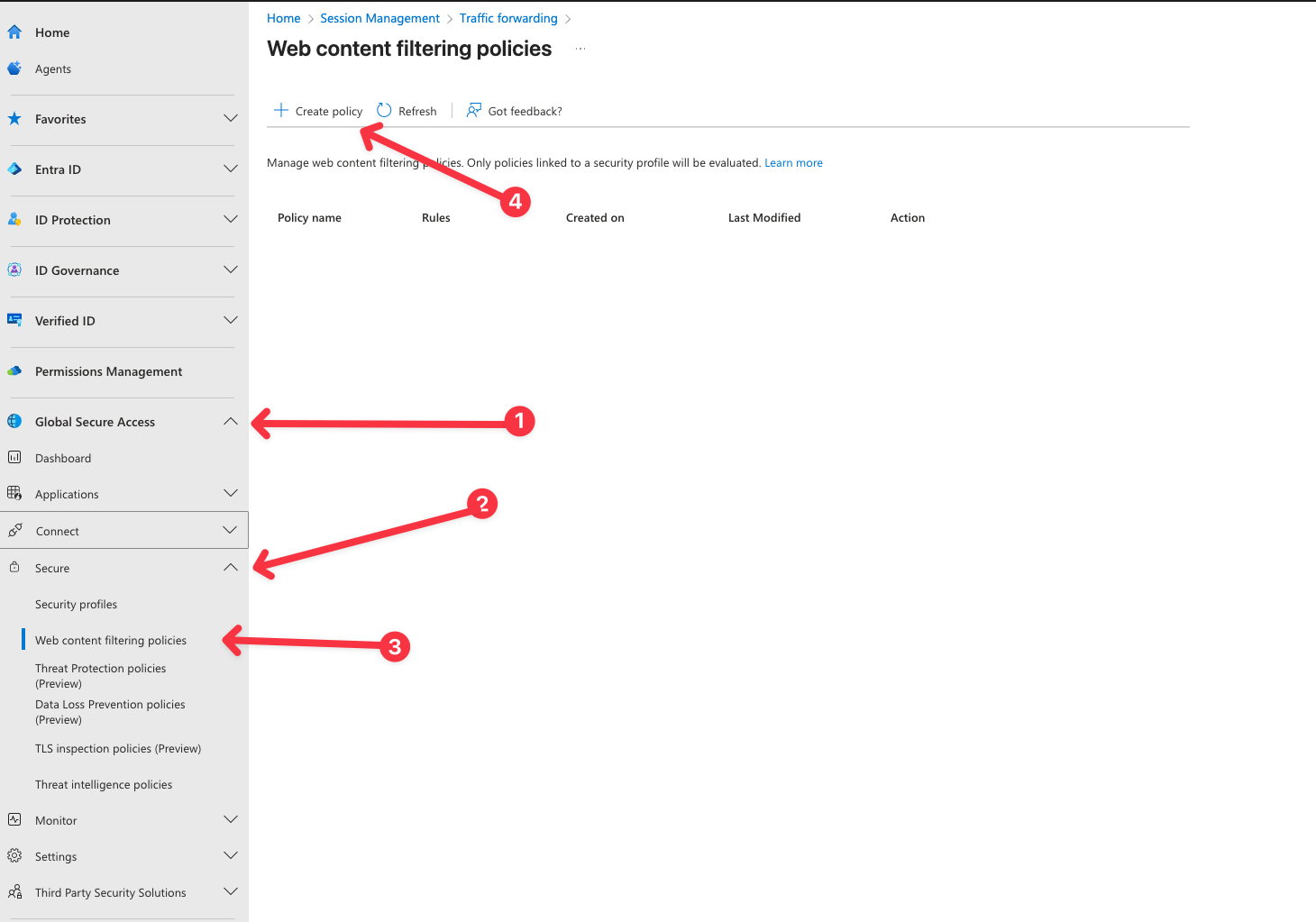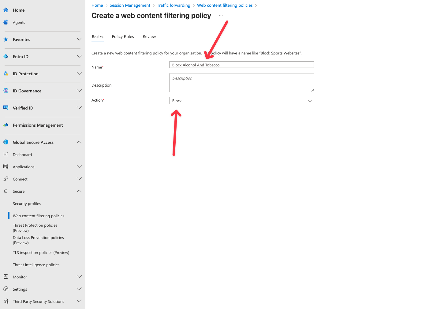 - In Entra Portal, Browse to Global Secure Access -> Secure -> web content filtering policy.