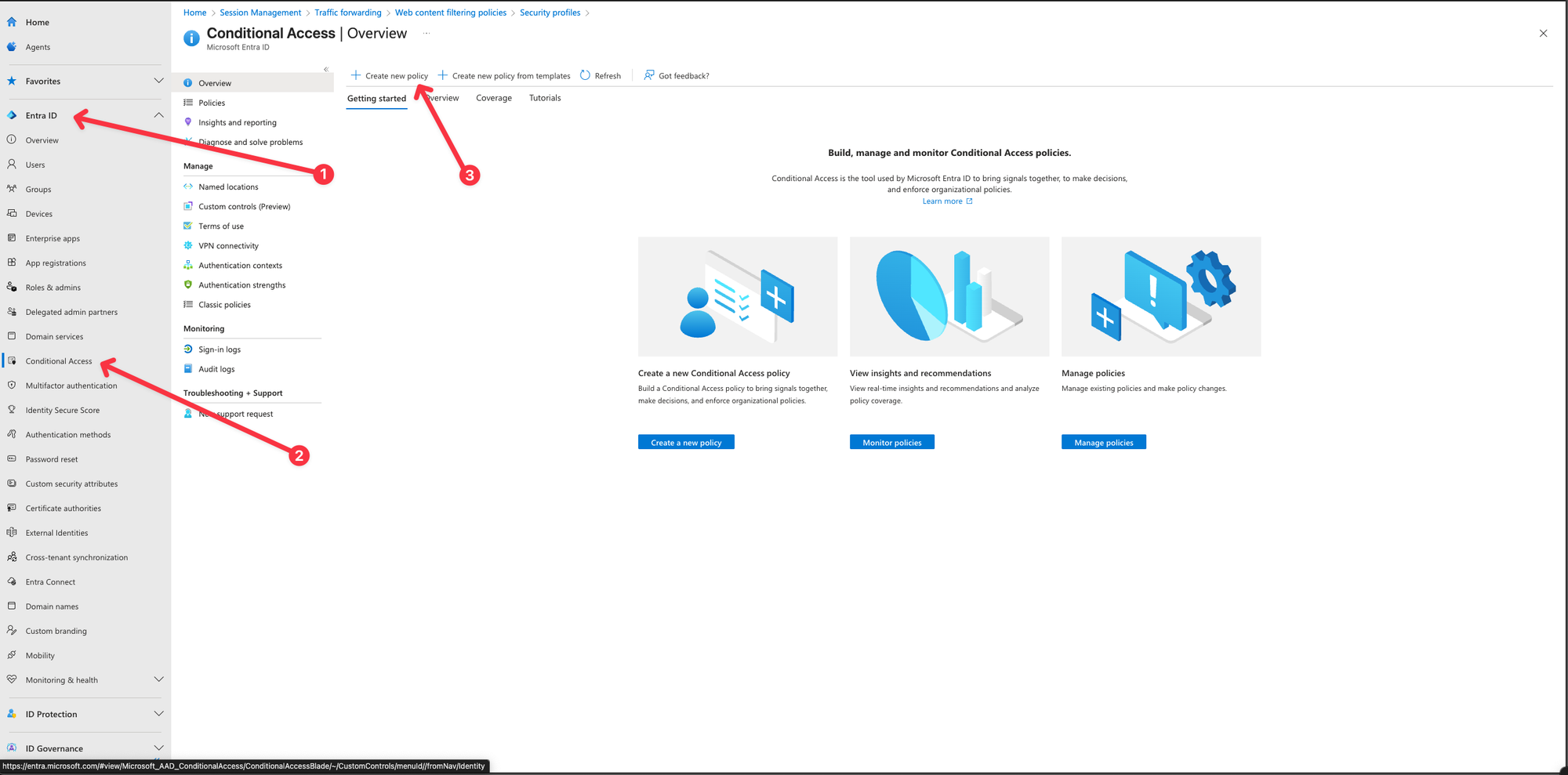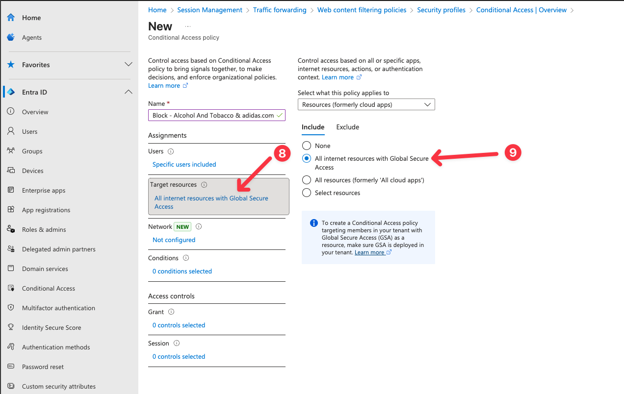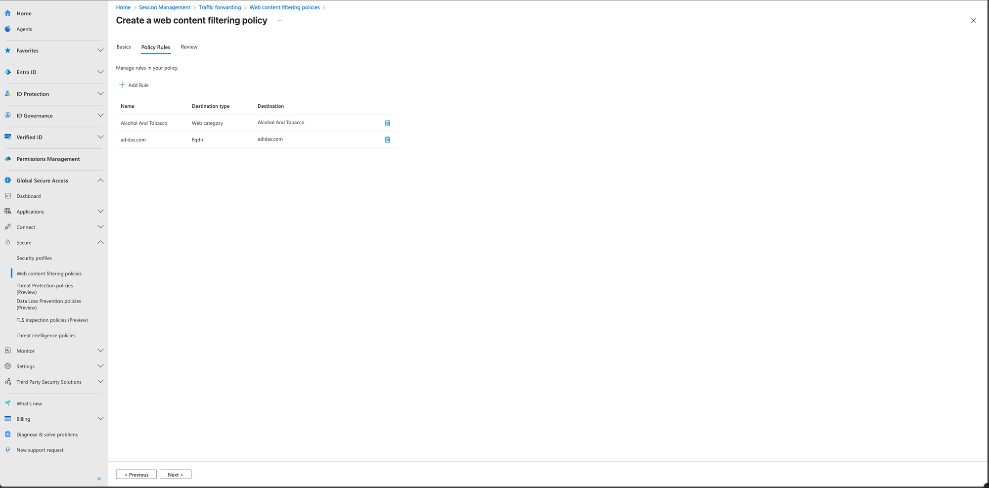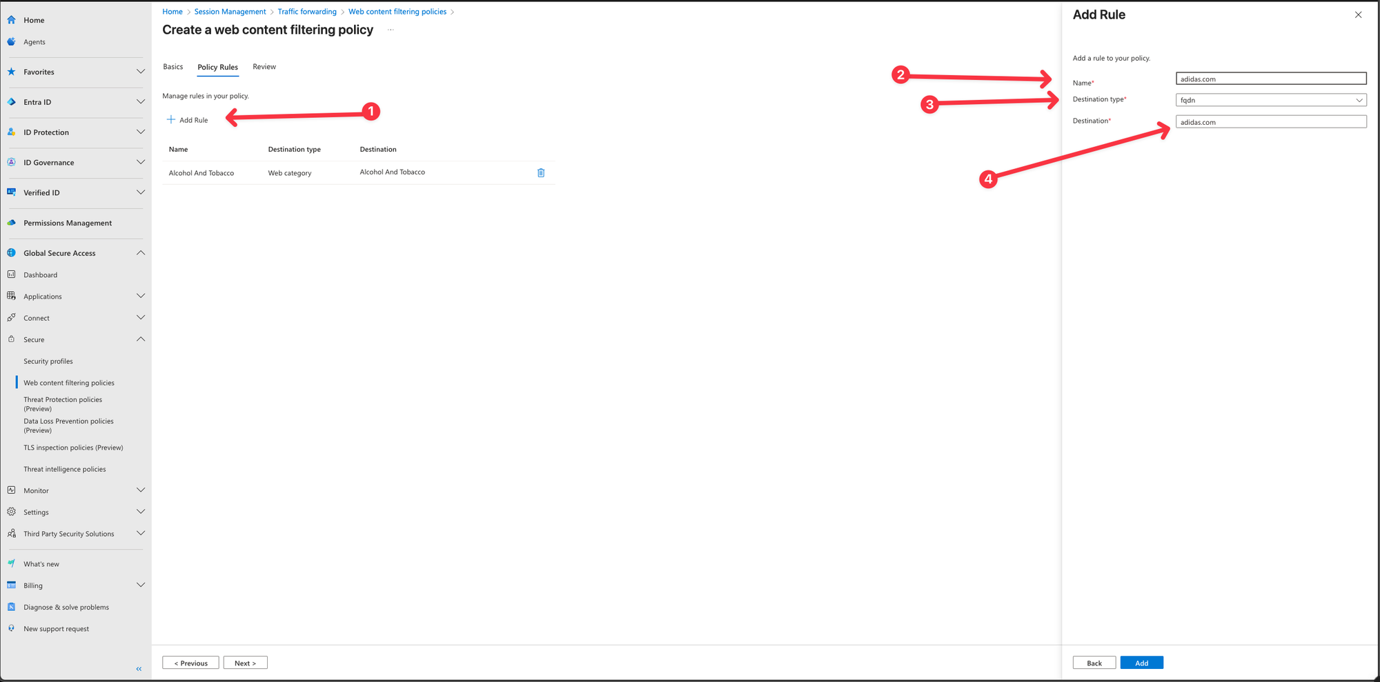 - In Entra Portal, Browse to Global Secure Access -> Secure -> web content filtering policy.