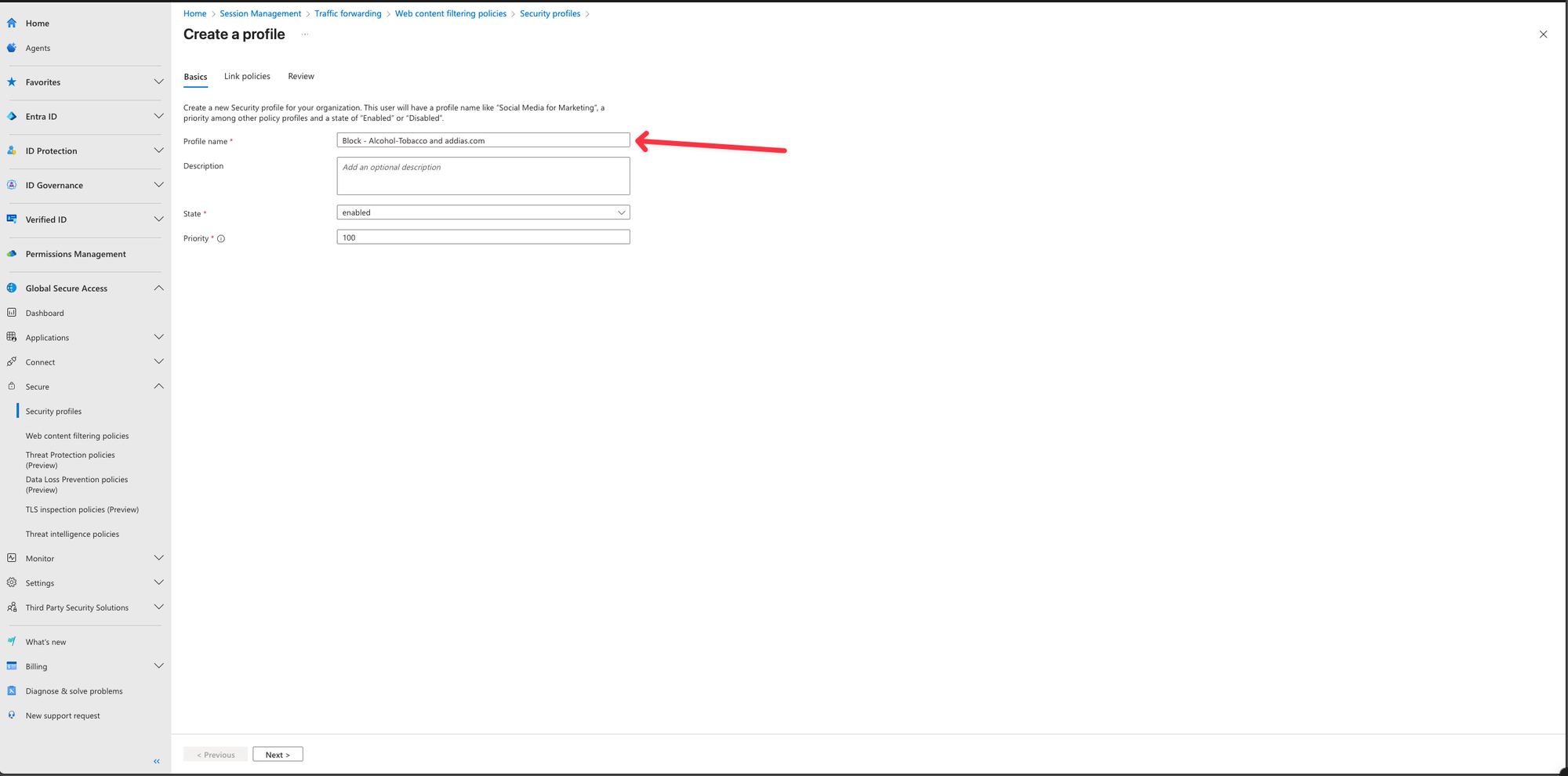 In this step, you create a security profile to group filtering policies. Then you assign, or link, the security profiles with a Conditional Access policy to make them user or context aware.