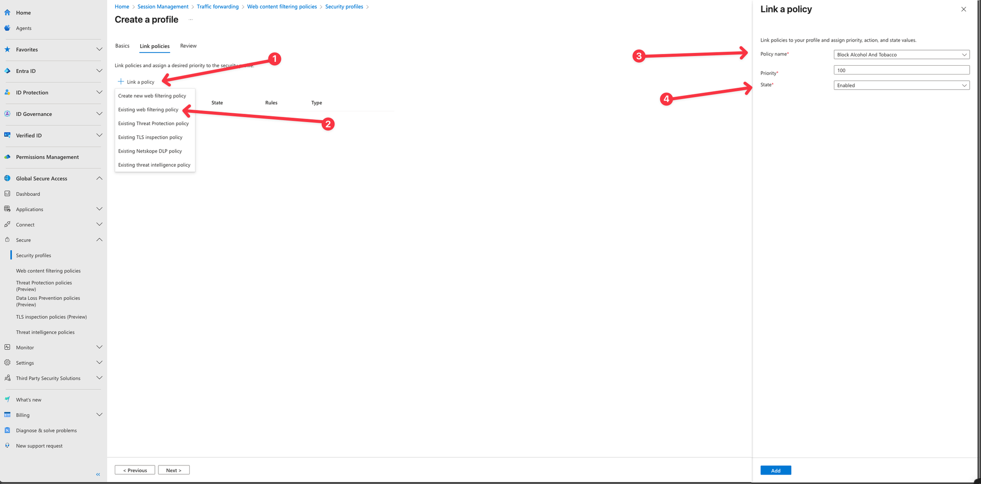 - Select Link a policy and then select Existing web filtering policy. Select the Policy we have created and click Add