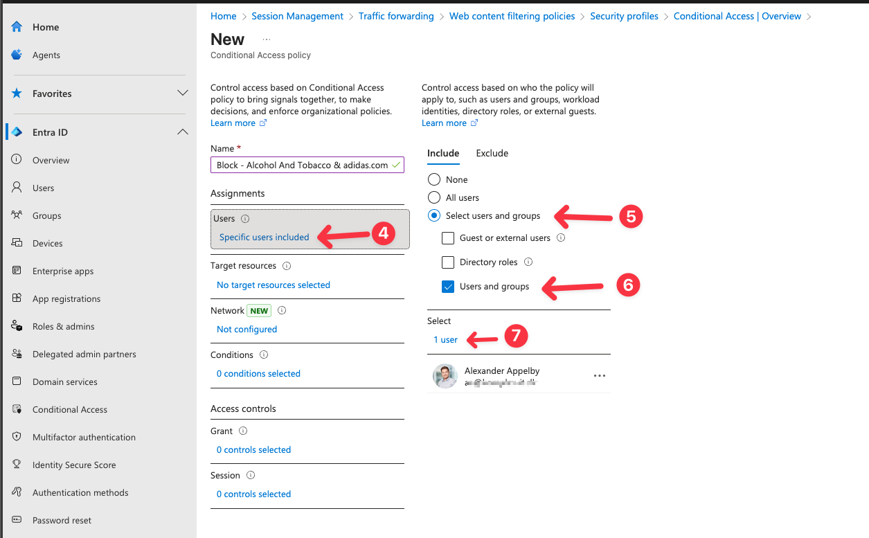 Create a Conditional Access policy for end users or groups and deliver your security profile through Conditional Access Session controls. Conditional Access is the delivery mechanism for user and context awareness for Internet Access policies. To learn more about session controls, see Conditional Access: Session.