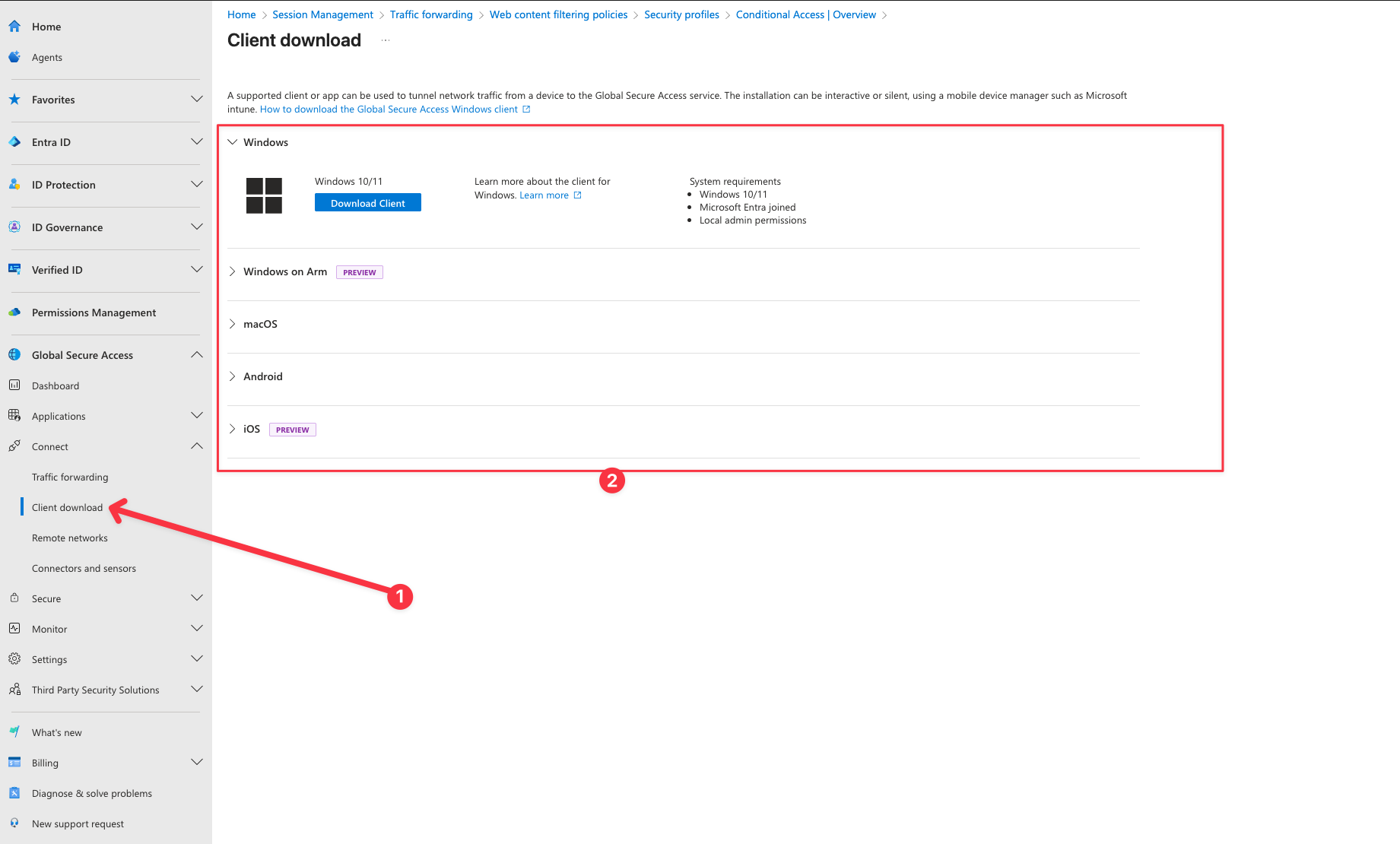 - In Entra Portal, Browse to Global Secure Access -> Connect -> Client download