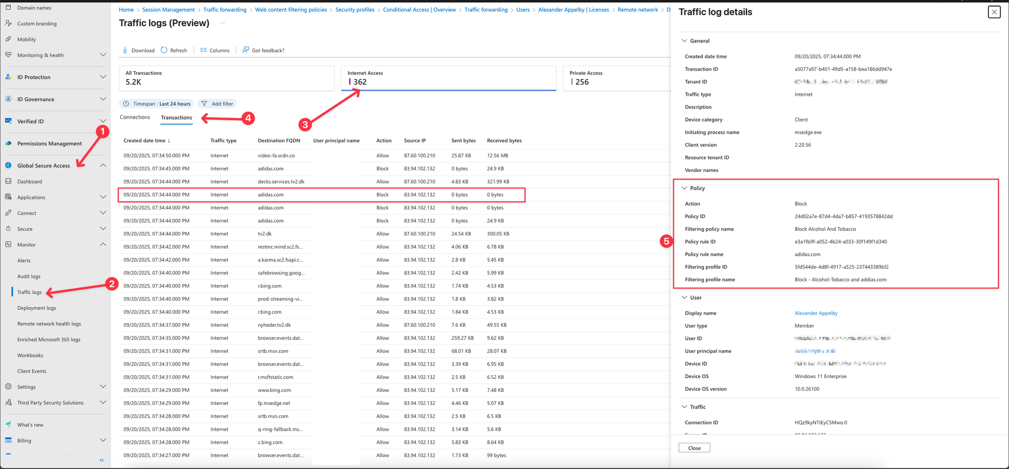 Let’s review the Traffic logs in the Entra portal and examine the corresponding Transaction logs.