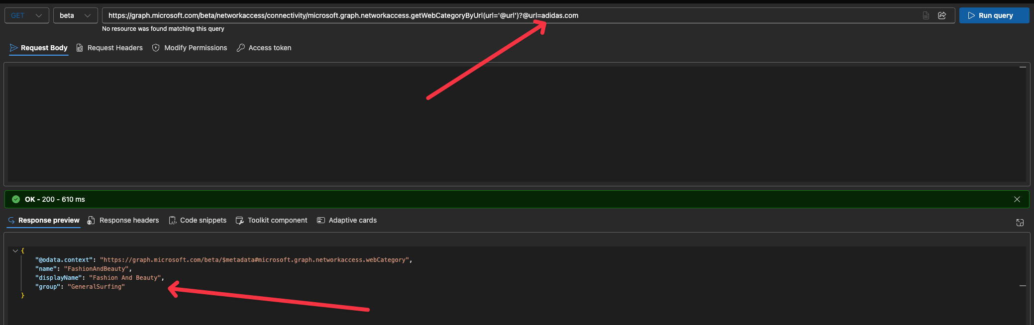 GET https://graph.microsoft.com/beta/networkaccess/connectivity/microsoft.graph.networkaccess.getWebCategoryByUrl(url='@url')?@url=example.com