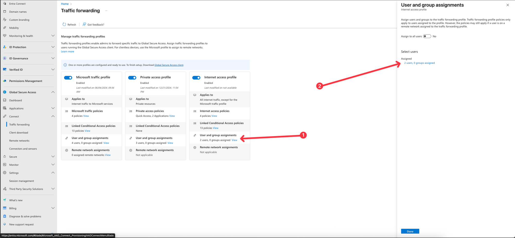 - Entra ID P1/P2, and Entra Suite or GSA Internet Access Addon license for the users