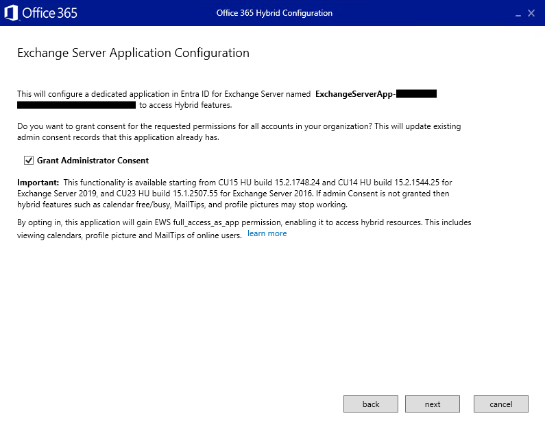The Hybrid Configuration Wizard creates a dedicated application named "ExchangeServerApp-{your organization GUID}" in Entra ID, handles permissions and certificates, and grants admin consent. However, Microsoft explicitly states that